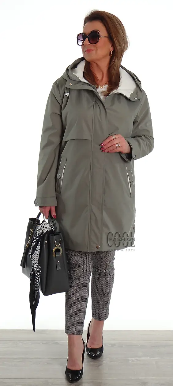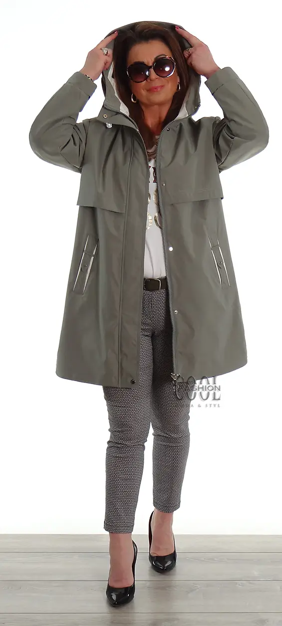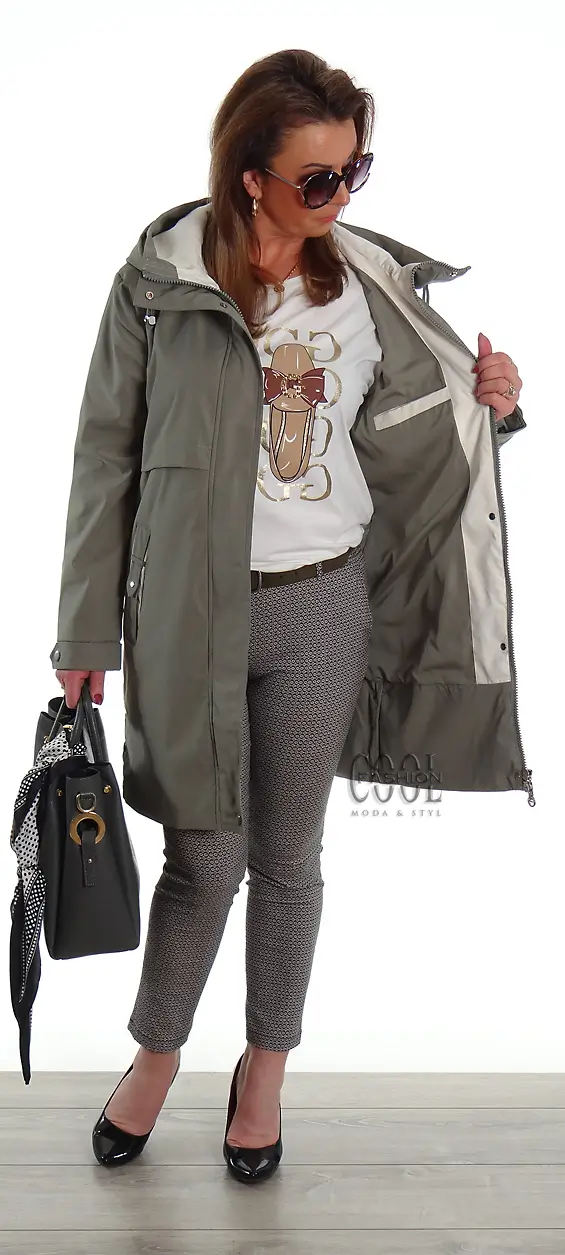 Ocieplony płaszczyk z pikowaną podszewką i odpinanym kapturem. Posiada dwie funkcjonalne kieszenie zapinane na zamek oraz jedną wewnątrz. Zapinane na napy boczne rozcięcia dają możliwość poszerzenia obwodu. W kapturze są troczki ściągające dla wymodelowania kształtu. Płaszczyk jest lekko ocieplony, dzięki temu do wynoszenia na wiosnę oraz jesień. Doskonała jakość wykonania.