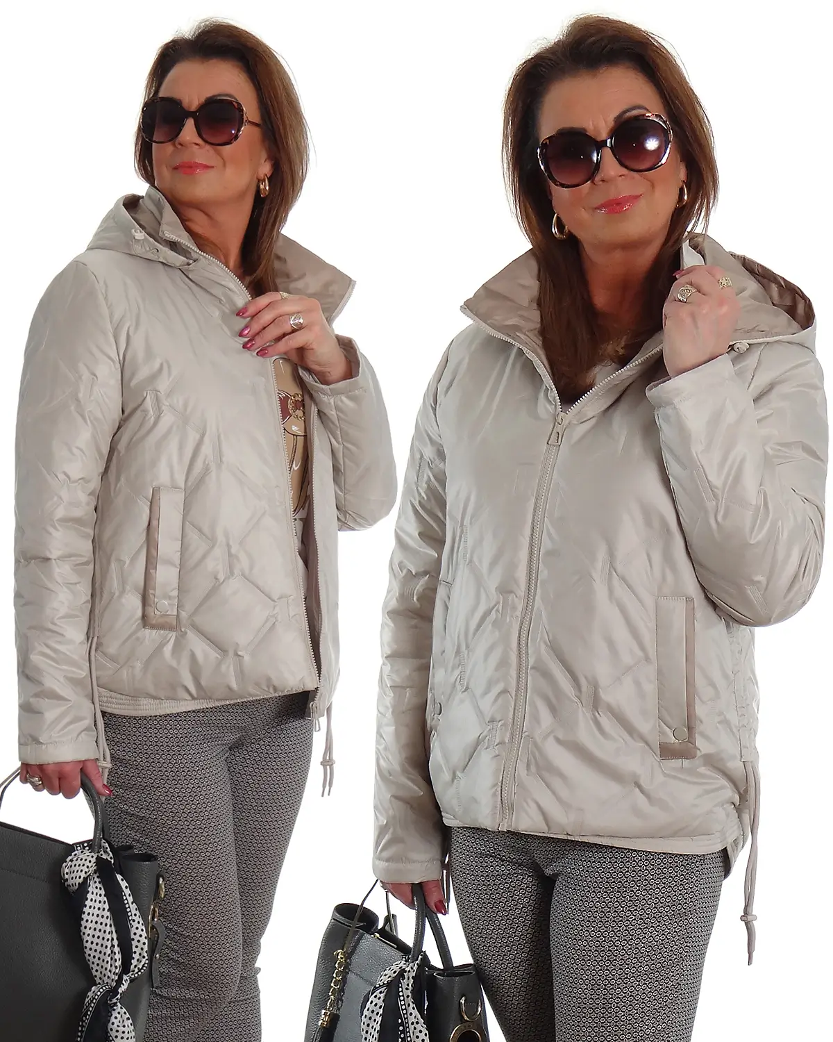 Przejściowa lekko taliowana kurtka z odpinanym kapturem. Kurtka zapinana jest na zamek błyskawiczny. Posiada dwie wsuwane kieszenie. W kapturze są troczki ściągające dla wymodelowania kształtu. Tył kurtki jest przedłużany. Po bokach u dołu wcięcia z regulacją wysokości. Posiada kontrastową podszewkę kaptura i kołnierzyka. Lekko ocieplona do wynoszenia na wiosnę oraz jesień. Bardzo komfortowa w noszeniu, ultralekka i wygodna. Idealna dla idącej z modowymi nowościami. Kurtki nowe prosto od producenta z metkami i w oryginalnym opakowaniu.