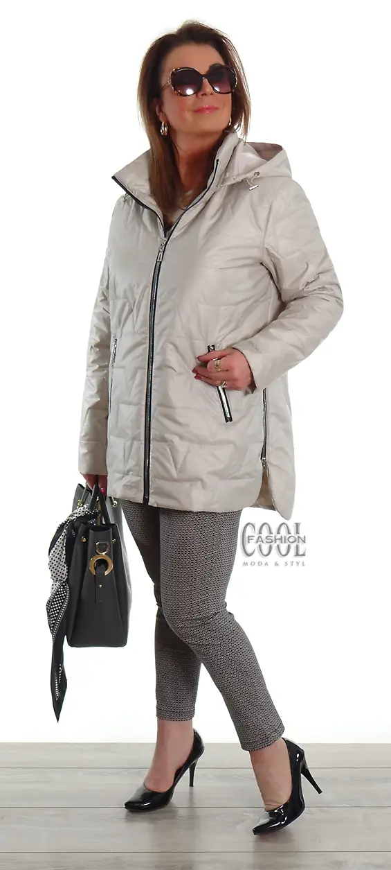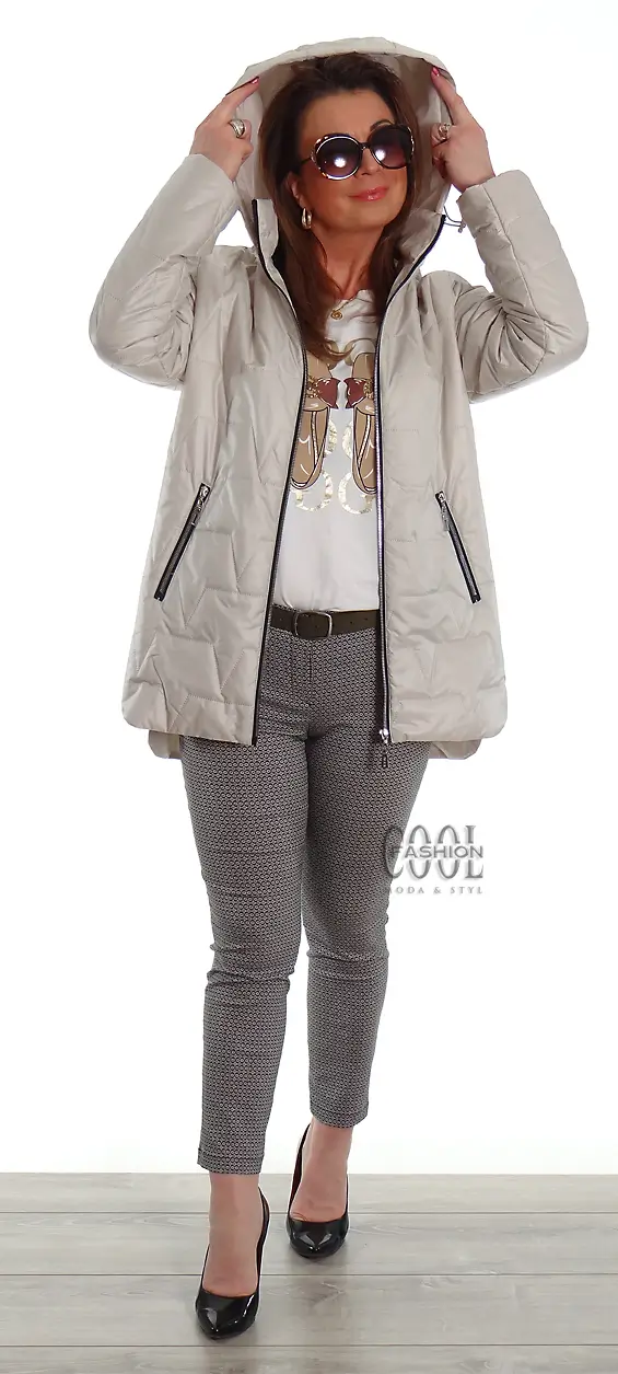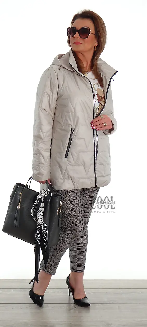 Przejściowa lekko ocieplona dłuższa kurtka z odpinanym kapturem. Krój asymetryczny, przedłużony tył. Subtelne pikowanie. Kurtka zapinana jest na zamek. Posiada dwie kieszenie zapinane suwakiem. W kapturze są troczki ściągające dla wymodelowania kształtu. Po bokach rozcięcia zapinane zamkiem. Do wynoszenia na wiosnę oraz jesień.